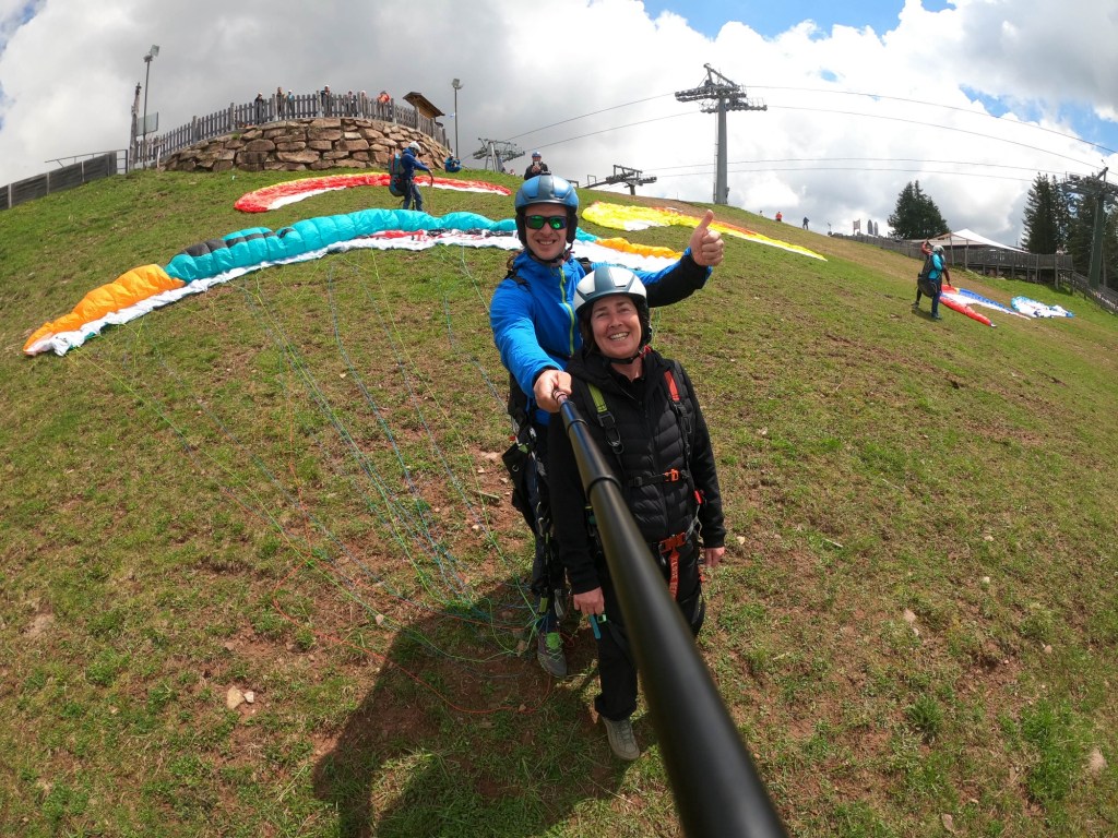 Angekommen geht es pünktlich los. Julian und Isidor sind unsere Flugbegleiter . Schnell mit der Gondel auf den Berg und auf die Abflugwiese.